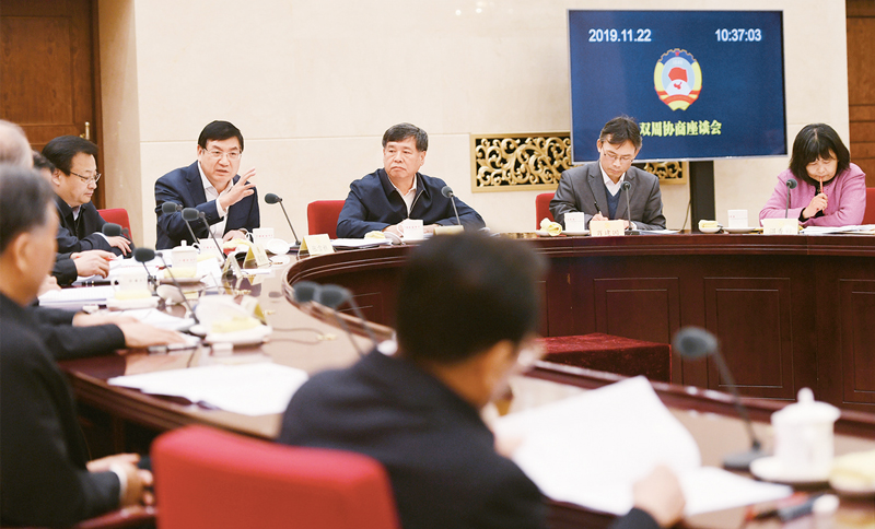 雙周協(xié)商座談會(huì)是政協(xié)民主協(xié)商的重要形式之一,是政協(xié)委員與中央和國(guó)家機(jī)關(guān)定期座談交流黨和國(guó)家重大關(guān)鍵課題的協(xié)商平臺(tái)。圖為2019年11月22日,全國(guó)政協(xié)舉行“協(xié)同推進(jìn)公益訴訟檢察工作”雙周協(xié)商座談會(huì)。會(huì)上,委員、專家和相關(guān)部委負(fù)責(zé)同志就如何貫徹落實(shí)黨的十九屆四中全會(huì)精神,調(diào)動(dòng)各方力量共同探索公益司法保護(hù)的“中國(guó)方案”,展開(kāi)熱烈討論。 人民政協(xié)報(bào) 田福良/攝