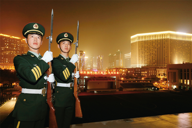 夜幕降臨、華燈初上,璀璨的燈光把澳門這座“不夜城”裝飾得絢麗多彩。圖為駐澳門部隊(duì)某摩步連戰(zhàn)士在站崗,用實(shí)際行動(dòng)守護(hù)澳門繁華。 南部戰(zhàn)區(qū)供圖