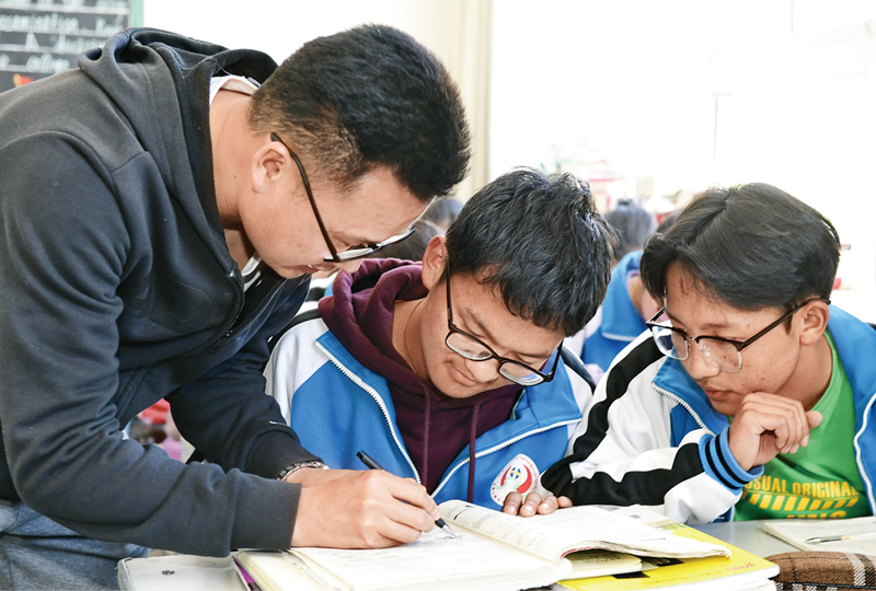 2015年以后陸續(xù)啟動(dòng)實(shí)施醫(yī)療、教育人才“組團(tuán)式”援藏援疆工作。圖為2019年5月7日,參加“組團(tuán)式”教育援藏工作的湖北省宜昌市秭歸一中的老師宋成(左),在西藏山南市第一高級(jí)中學(xué)為高三學(xué)生輔導(dǎo)功課。 新華社記者 張汝鋒/攝