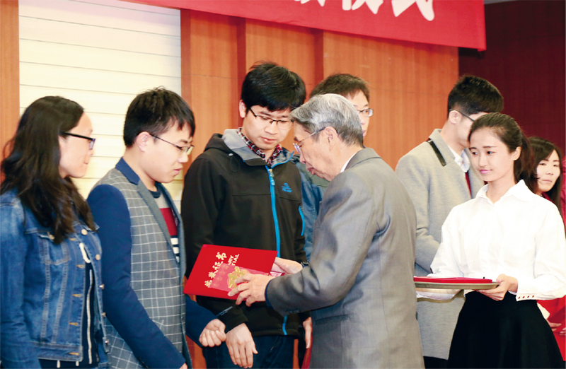 2010年,年逾八旬的陳俊武牽頭在鄭州大學(xué)化工與能源學(xué)院組建了河南省石油補充替代能源研究院士工作站,指導(dǎo)團隊從事生物燃料方面的研究論證工作。他多次到鄭州大學(xué)講課,同時通過電子郵件等方式對鄭州大學(xué)的研究團隊給予悉心指導(dǎo),還培養(yǎng)了4名博士后。2016年1月,團隊研究成果以80多萬字的專著《生物基燃料技術(shù)經(jīng)濟評估》呈現(xiàn),為國家能源戰(zhàn)略決策提供了重要參考。圖為2016年陳俊武為鄭州大學(xué)優(yōu)秀研究生頒獎。 中國石化供圖
