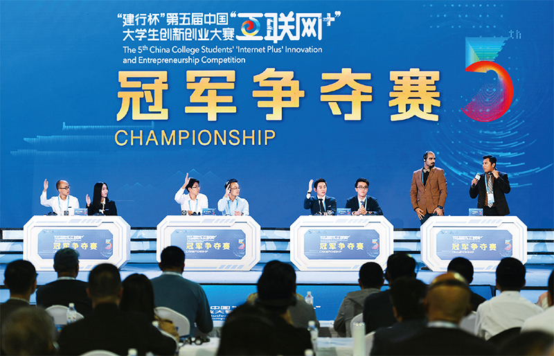 “雙創(chuàng)”已成為時(shí)代熱潮,創(chuàng)業(yè)帶動(dòng)就業(yè)的倍增效應(yīng)不斷顯現(xiàn)。2019年10月14日,第五屆中國(guó)“互聯(lián)網(wǎng)+”大學(xué)生創(chuàng)新創(chuàng)業(yè)大賽冠軍爭(zhēng)奪賽在浙江杭州舉行,來(lái)自清華大學(xué)、浙江大學(xué)等高校的創(chuàng)業(yè)者攜創(chuàng)新創(chuàng)業(yè)項(xiàng)目展開(kāi)路演角逐。圖為多名創(chuàng)業(yè)者在互動(dòng)提問(wèn)。 中新社記者 王剛/攝