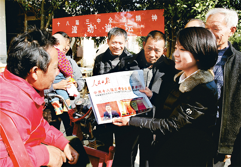 習近平總書記強調(diào)指出,黨的十九屆四中全會和黨的十八屆三中全會歷史邏輯一脈相承、理論邏輯相互支撐、實踐邏輯環(huán)環(huán)相扣,目標指向一以貫之,重大部署接續(xù)遞進。黨的十九屆四中全會不僅系統(tǒng)集成了黨的十八屆三中全會以來全面深化改革的理論成果、制度成果、實踐成果,而且對新時代全面深化改革勾勒出更加清晰的頂層設計。圖為2013年12月3日,江西省萬年縣湖云鄉(xiāng)宣講團成員在吾峰村農(nóng)家大院里向村民宣傳黨的十八屆三中全會精神。 中新社 徐聲高/攝