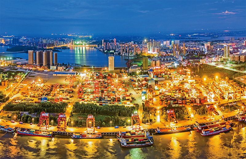 武漢陽(yáng)邏港是長(zhǎng)江中游航運(yùn)中心的核心港區(qū)及最大的集裝箱專業(yè)港區(qū),2019年完成集裝箱吞吐量161.23萬標(biāo)箱。圖為正在裝卸貨物的陽(yáng)邏港。 長(zhǎng)江日?qǐng)?bào)供圖