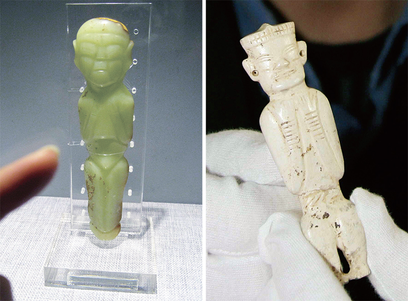 中華文明考古發(fā)現(xiàn)充分證明,文明因交流而多彩、因互鑒而豐富和發(fā)展。東北地區(qū)西部的紅山文化高等級墓葬,和與其大體同時(shí)的安徽凌家灘遺址貴族墓葬,都出土了形制十分相近的玉人、玉龍、玉龜和玉鳥。左圖為紅山文化遺址出土的玉人,右圖為安徽凌家灘遺址出土的玉人。 新華社記者 汪永基/攝