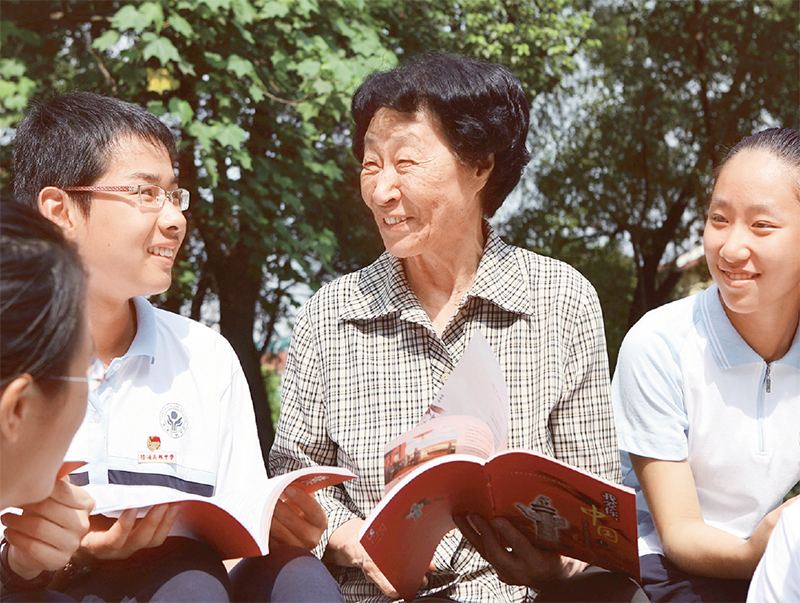 于漪(中)與同學(xué)們?cè)谝黄?新華社記者 劉穎/攝