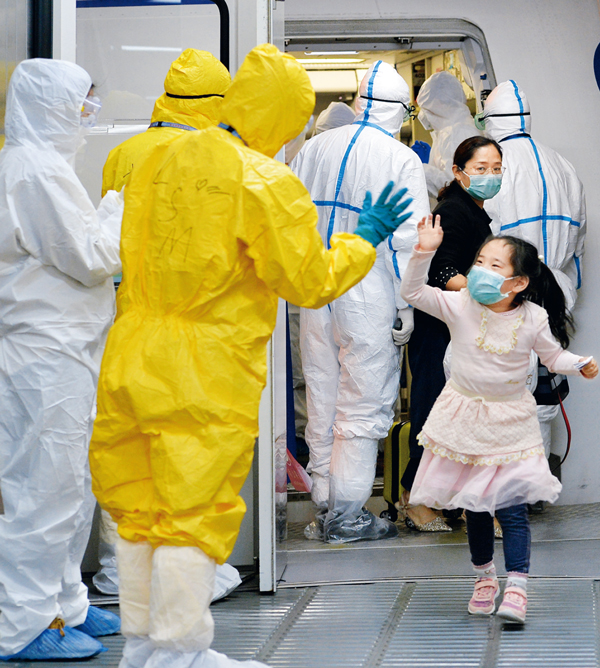 石油石化、電力、通信、糧油、航空運(yùn)輸?shù)然A(chǔ)保障型央企把做好保供工作作為首業(yè)首責(zé),強(qiáng)化擔(dān)當(dāng)意識(shí)、周密組織生產(chǎn)、全力保障供應(yīng),優(yōu)先保障重點(diǎn)地區(qū)需要,合力筑起抗擊疫情的堅(jiān)強(qiáng)后盾。圖為2020年2月5日晚,乘坐東方航空公司包機(jī)從新加坡回武漢的一名剛下飛機(jī)的小姑娘跟地服人員打招呼。當(dāng)晚,從日本大阪和新加坡飛來(lái)的國(guó)航和東航的兩架民航飛機(jī)在武漢天河國(guó)際機(jī)場(chǎng)降落,370名湖北人終于回家。 湖北日?qǐng)?bào)全媒記者 魏錸/攝