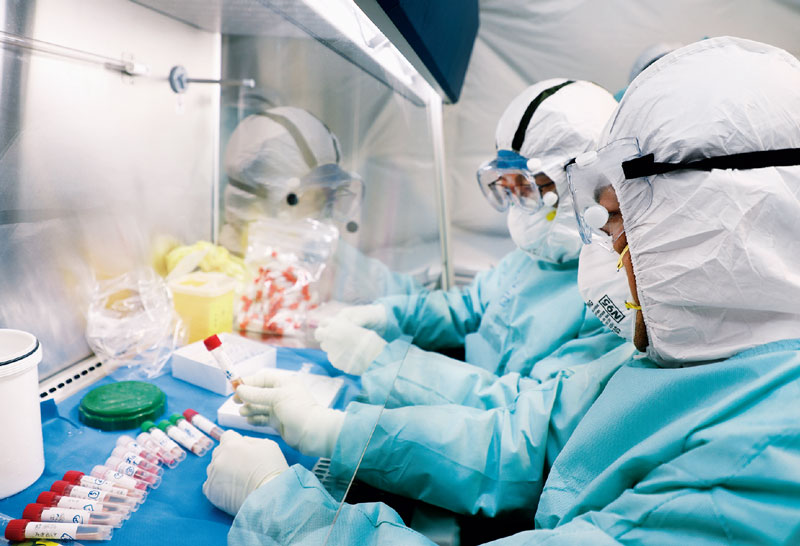 圖為在武漢抗疫一線的軍隊(duì)醫(yī)學(xué)專家組人員正在進(jìn)行樣本處理 軍事醫(yī)學(xué)研究院供圖