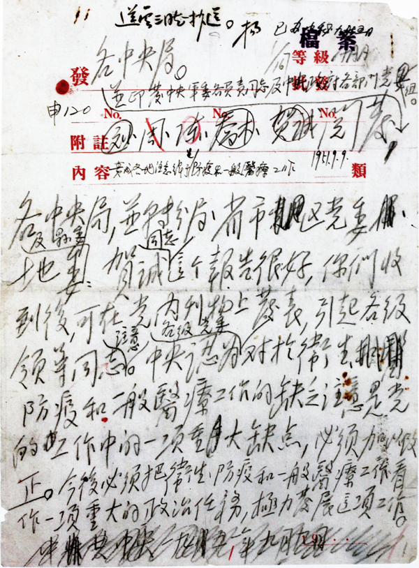 1951年9月7日,衛(wèi)生部黨組書記、副部長(zhǎng)賀誠(chéng)在給中央關(guān)于全國(guó)防疫工作的報(bào)告中,總結(jié)了新中國(guó)成立以來衛(wèi)生工作遵循“面向工農(nóng)兵、預(yù)防為主、團(tuán)結(jié)中西醫(yī)”三項(xiàng)原則取得的成績(jī)和工作中還存在的缺點(diǎn)。報(bào)告得到毛澤東同志的高度重視,他在以中央名義起草的指示中明確提出:“今后必須把衛(wèi)生、防疫和一般醫(yī)療工作看作一項(xiàng)重大的政治任務(wù),極力發(fā)展這項(xiàng)工作?!眻D為指示原件。
