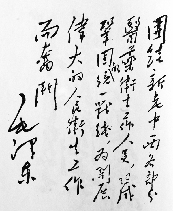 圖為1950年毛澤東同志為第一屆全國(guó)衛(wèi)生工作會(huì)議的題詞:“團(tuán)結(jié)新老中西各部分醫(yī)藥衛(wèi)生工作人員,組成鞏固的統(tǒng)一戰(zhàn)線,為開展偉大的人民衛(wèi)生工作而奮斗?!?/font>
