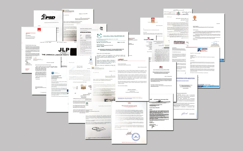 目前,已有130多個國家的300多個政黨和政治組織共600多人次向習近平總書記和中共中央發(fā)來電函或通過發(fā)表聲明、文章等表示慰問支持。圖為部分政黨來函。 中共中央對外聯(lián)絡部供圖