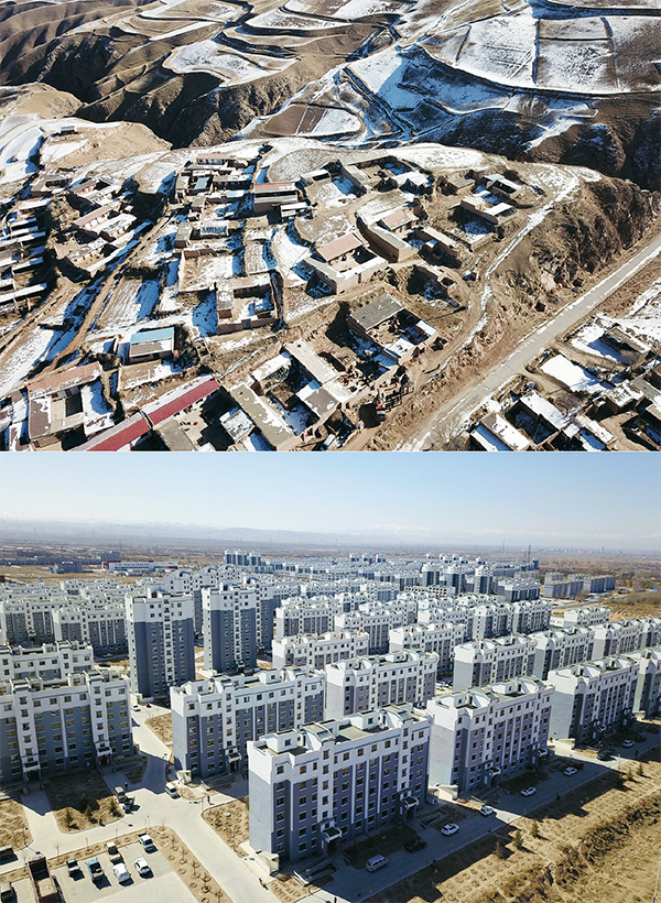 甘肅省武威市古浪縣屬于六盤山集中連片特困地區(qū),自2013年以來,當地下定決心將南部貧困山區(qū)的新堡、干城、橫梁等鄉(xiāng)鎮(zhèn)和數十個行政村實施易地扶貧搬遷,整鄉(xiāng)整村搬遷至黃花灘生態(tài)移民區(qū)。經過多年的持續(xù)努力和攻堅,在易地扶貧搬遷等一系列扶貧政策和措施的推動下,古浪縣于2020年初實現整體脫貧摘帽。上圖為2018年2月6日拍攝的古浪縣黃羊川鎮(zhèn)石城村原貌(無人機照片);下圖為2020年3月10日拍攝的石城村群眾易地扶貧搬遷入住的古浪縣黃花灘生態(tài)移民區(qū)綠洲生態(tài)移民小鎮(zhèn)(無人機照片)。 新華社記者 范培珅/攝