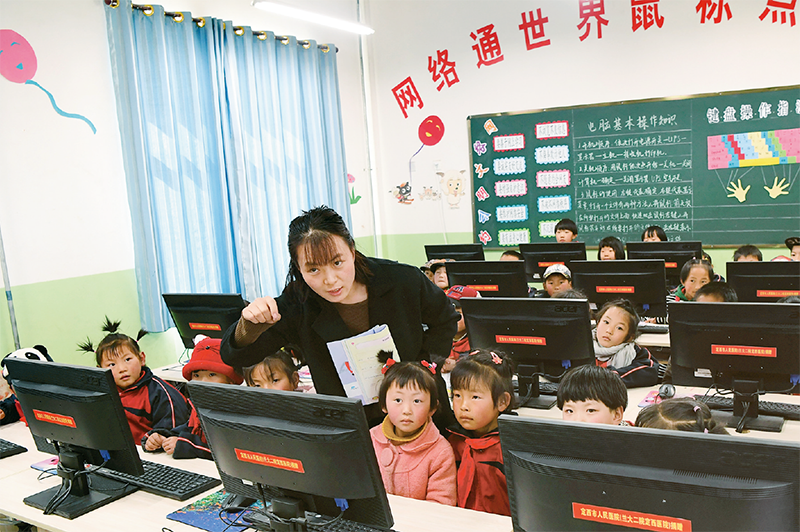 讓貧困地區(qū)的孩子們接受公平而有質量的教育,是阻斷貧困代際傳遞的重要途徑。圖為2018年3月12日,甘肅省渭源縣田家河鄉(xiāng)元古堆村小學的老師利用網絡開展教學。 甘肅日報供圖
