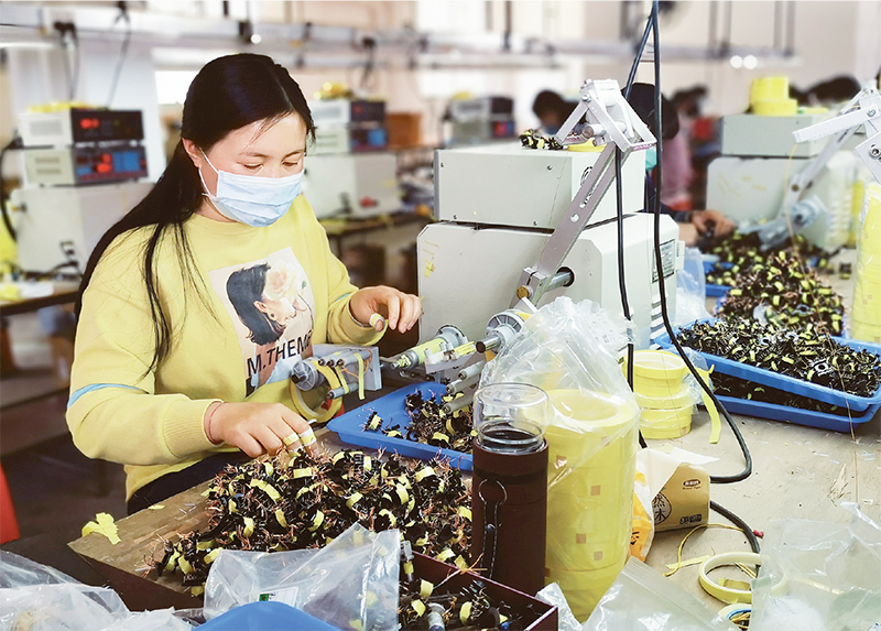 廣西隆林各族自治縣是廣西極度貧困縣之一。近期,當(dāng)?shù)卣e極支持本地勞動(dòng)力密集型企業(yè)復(fù)工復(fù)產(chǎn),促進(jìn)貧困戶增收。圖為在廣西隆林鶴城新區(qū)的扶貧車間,工人在加工電子變壓器。 新華社記者 劉偉/攝