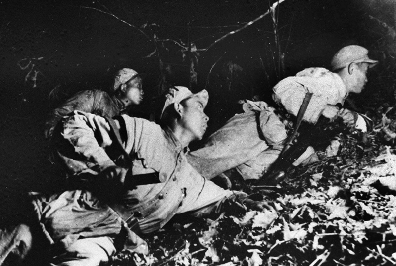 在1952年秋季的上甘嶺戰(zhàn)役中,中國(guó)人民志愿軍與6萬(wàn)多敵人浴血激戰(zhàn)43天,打退其900多次進(jìn)攻,堅(jiān)守住了陣地,斃傷俘敵2.5萬(wàn)余人,體現(xiàn)了大無(wú)畏的革命英雄主義和愛國(guó)主義、國(guó)際主義精神。圖為堅(jiān)守在坑道里的戰(zhàn)士夜間出擊。 新華社發(fā)