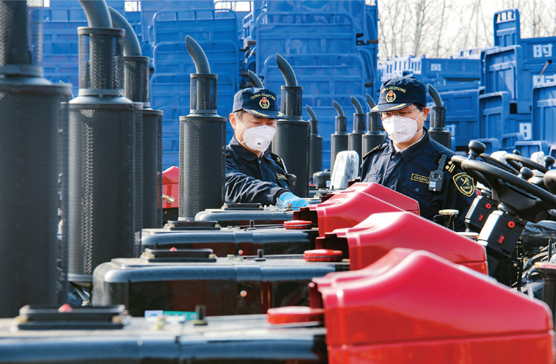 為統(tǒng)籌做好疫情防控和通關(guān)便利化工作,海關(guān)總署出臺一攬子政策措施,大力支持企業(yè)復(fù)工復(fù)產(chǎn),全力以赴促進(jìn)外貿(mào)穩(wěn)增長。圖為2020年2月21日,山東濟(jì)南海關(guān)所屬聊城海關(guān)關(guān)員現(xiàn)場驗放山東時風(fēng)集團(tuán)出口產(chǎn)品,幫扶企業(yè)按時交付海外訂單。 聊城海關(guān)供圖 鄭保國/攝