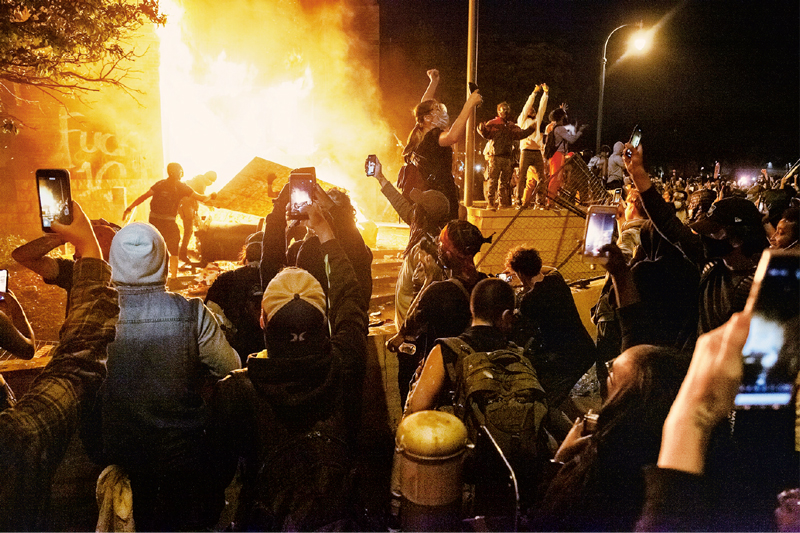 美國明尼蘇達州明尼阿波利斯市警察2020年5月25日暴力執(zhí)法致一名非裔男子死亡,該事件導致大批民眾走上街頭抗議,抗議還逐漸蔓延到紐約、洛杉磯等地。明尼阿波利斯市的部分抗議活動逐步升級為騷亂,出現(xiàn)打砸搶燒事件,不少商店被搶,一些建筑和車輛遭破壞和焚燒。圖為5月28日,明尼阿波利斯市的示威者點燃一警察局。 新華社發(fā) 本·霍夫蘭/攝