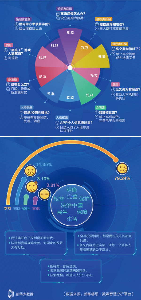 新華睿思數(shù)據(jù)顯示,民法典草案在網(wǎng)上征求意見過程中,“離婚冷靜期”、“高空拋物”、“高利放貸”等問題關(guān)注度高。網(wǎng)民對民法典草案普遍表示支持和肯定,認(rèn)為“民法典開啟了權(quán)利保護(hù)新時代”、“法治中國給老百姓帶來實(shí)實(shí)在在的好處”。(數(shù)據(jù)統(tǒng)計時間:2020年5月23日9:00—5月24日12:00) 新華網(wǎng)《睿思一刻》供圖