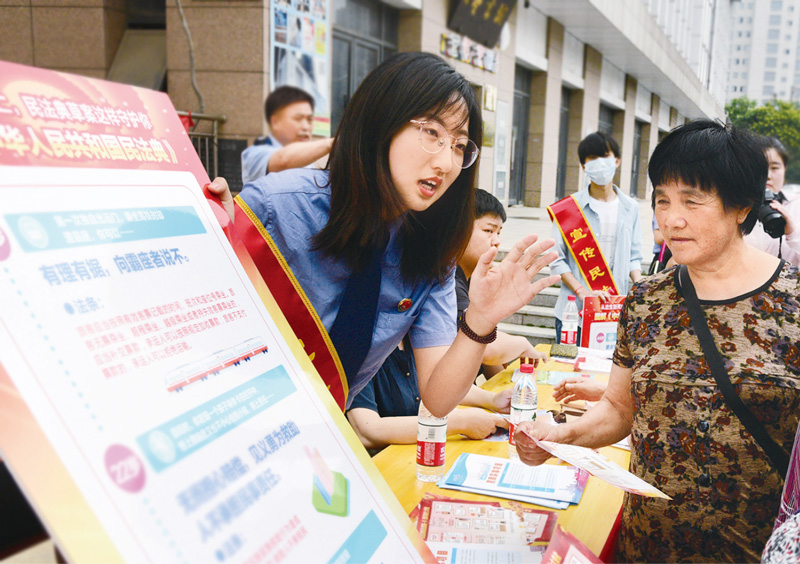 2020年6月3日,江蘇省鎮(zhèn)江市潤州區(qū)七里甸街道聯(lián)合公安、檢察院、法院、司法等部門開展“民法典守護(hù)你”送法進(jìn)社區(qū)活動。圖為檢察院工作人員在為社區(qū)居民解讀民法典的相關(guān)內(nèi)容。 人民圖片 石玉成/攝