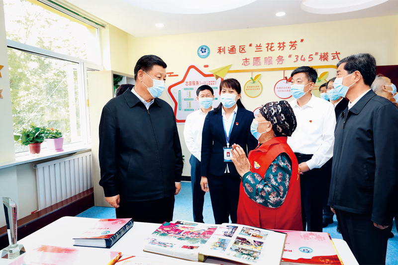 2020年6月8日至10日,中共中央總書記、國家主席、中央軍委主席習(xí)近平在寧夏考察。這是6月8日下午,習(xí)近平在吳忠市利通區(qū)金花園社區(qū)黨群活動(dòng)服務(wù)中心,同社區(qū)志愿者代表親切交談。 新華社記者 鞠鵬/攝