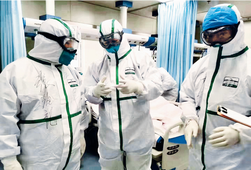 2020年2月10日,中央指導(dǎo)組專家張伯禮院士(左)在武漢市中醫(yī)醫(yī)院查看新冠肺炎重癥患者,指導(dǎo)中醫(yī)藥救治。 天津中醫(yī)藥大學(xué)供圖