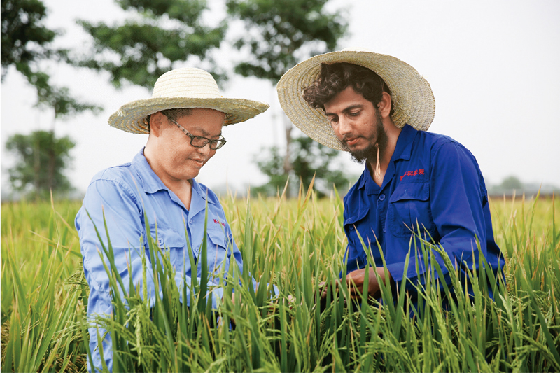 中國(guó)在打贏脫貧攻堅(jiān)戰(zhàn)過(guò)程中始終致力于同世界各國(guó)一道,攜手推進(jìn)國(guó)際減貧進(jìn)程,合力建設(shè)遠(yuǎn)離貧困、共享繁榮的美好世界。圖為2019年7月10日,在巴基斯坦東部旁遮普省首府拉合爾西南郊,來(lái)自中國(guó)的農(nóng)業(yè)專家(左)同當(dāng)?shù)丶夹g(shù)人員在稻田里進(jìn)行雜交水稻選種試驗(yàn)。中國(guó)專家“希望帶動(dòng)更多的巴基斯坦人創(chuàng)造出更多的雜交水稻品種,讓更多人吃飽飯”。 新華社記者 蔣超/攝