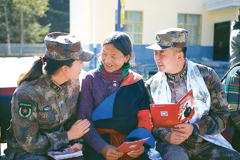 軍隊(duì)在參與脫貧攻堅(jiān)中,堅(jiān)持進(jìn)村入戶宣傳黨的惠民富民政策,傳遞黨的聲音,引導(dǎo)群眾堅(jiān)定聽(tīng)黨話、跟黨走、脫貧困、奔小康。圖為2018年10月,青海省軍區(qū)藏漢雙語(yǔ)小分隊(duì)深入藏鄉(xiāng)牧區(qū)宣傳黨的創(chuàng)新理論和惠民政策。 中央軍委政治工作部供圖