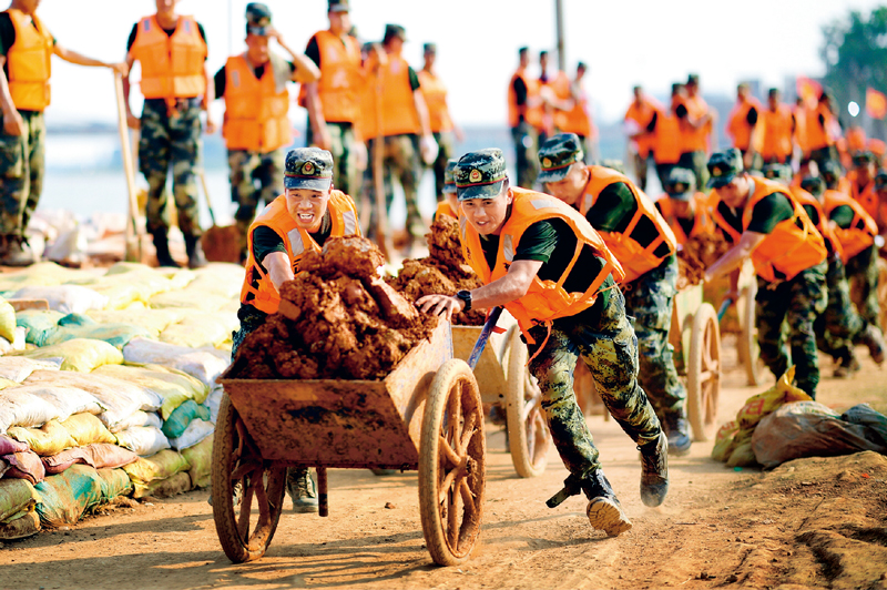 2020年7月以來,我國多地遭遇持續(xù)強降雨,發(fā)生嚴重洪澇災(zāi)害。人民至上、生命至上。提前轉(zhuǎn)移、緊急營救、妥善安置……一場涉及上百萬群眾生命的生死競速就此拉開。圖為2020年7月17日,武警江西總隊機動支隊黨員突擊隊在江西省鄱陽縣鄱陽鎮(zhèn)昌江圩用推車將余土推到空地堆放。 新華社發(fā) 曹先訓(xùn)/攝