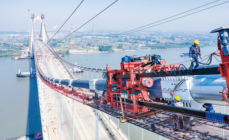 經過艱苦卓絕的努力,我國疫情防控阻擊戰(zhàn)取得重大戰(zhàn)略成果,統(tǒng)籌推進疫情防控和經濟社會發(fā)展工作取得積極成效?!拔逡弧逼陂g,江蘇省6個重大鐵路在建項目一線人員堅守崗位、抓緊施工,全力沖刺“時間過半、任務過半”和“四路兩橋”年內通車目標,“要把耽誤的時間搶回來”。圖為2020年4月29日連淮揚鎮(zhèn)鐵路五峰山長江大橋主纜索纏絲施工現(xiàn)場。?視覺江蘇網供圖 阮忠/攝