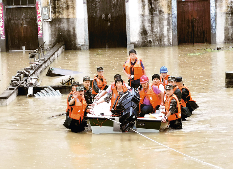 進(jìn)入梅雨期以來,安徽省多地遭遇強(qiáng)降雨天氣,出現(xiàn)內(nèi)澇、破圩、管涌等險情。武警安徽總隊黃山支隊聞汛而動,先后轉(zhuǎn)戰(zhàn)黃山、蕪湖等地,執(zhí)行轉(zhuǎn)移群眾、護(hù)航高考、災(zāi)區(qū)重建、堤壩搶險等任務(wù)。圖為2020年7月6日,武警安徽總隊黃山支隊官兵用沖鋒舟轉(zhuǎn)移受災(zāi)群眾。 新華社發(fā) 周磊/攝