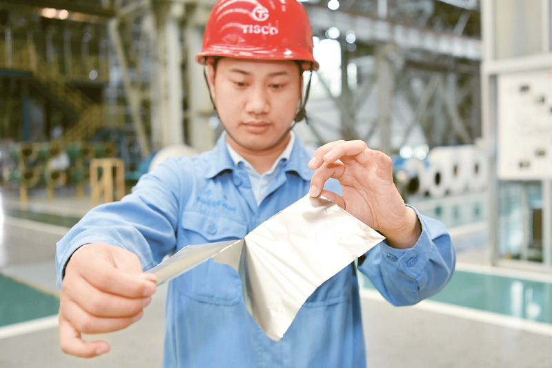太鋼不銹鋼精密帶鋼有限公司員工在展示用手撕開(kāi)0.02mm厚的寬幅軟態(tài)不銹鋼精密箔材 新華社記者 曹陽(yáng)/攝