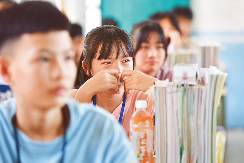 2019年9月,西北工業(yè)大學派出支教團到廣西融水苗族自治縣部分中學支教。近一年來,支教團成員積極創(chuàng)新教學方法,強化教學技能,深受老師認可和同學喜愛。2020年7月23日,融水苗族自治縣?;钢袑W1813班為支教老師舉辦送別班會,一名同學流下不舍的淚水。 新華社記者 黃孝邦/攝