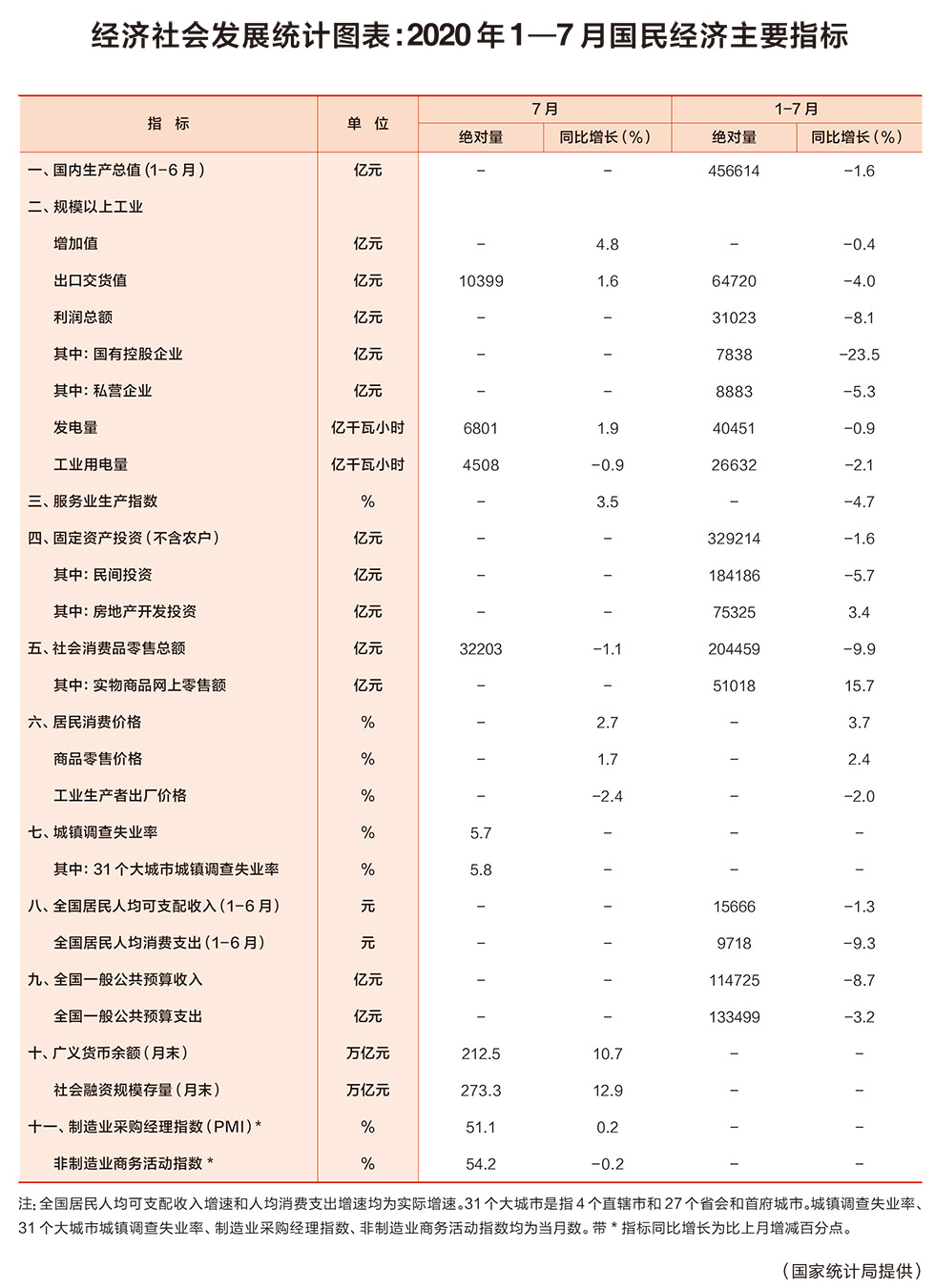 經(jīng)濟(jì)社會(huì)發(fā)展統(tǒng)計(jì)圖表:2020年1—7月國(guó)民經(jīng)濟(jì)主要指標(biāo)