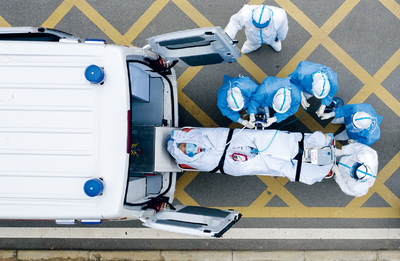 “保護(hù)人民生命安全和身體健康可以不惜一切代價(jià)。”在抗擊新冠肺炎疫情一線,醫(yī)務(wù)工作者盡最大努力搶救每一位患者。圖為2020年3月6日,在華中科技大學(xué)附屬同濟(jì)醫(yī)院,醫(yī)護(hù)人員護(hù)送一名剛做完CT檢查的新冠肺炎重癥患者上負(fù)壓救護(hù)車(無(wú)人機(jī)照片)。 新華社記者 才揚(yáng)/攝