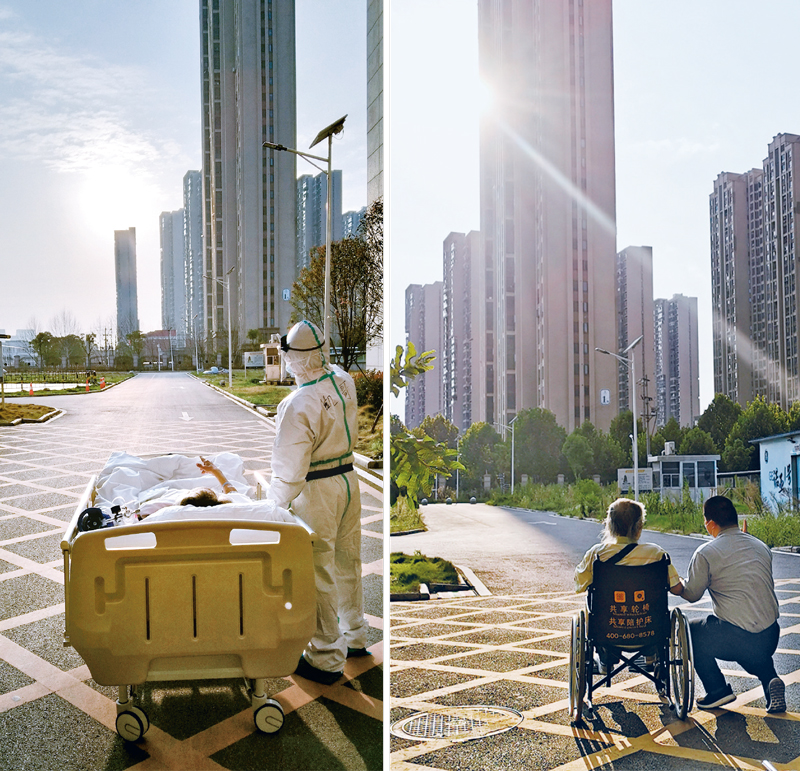 左圖為2020年3月5日,在武漢大學(xué)人民醫(yī)院東院,復(fù)旦大學(xué)附屬中山醫(yī)院援鄂醫(yī)療隊(duì)隊(duì)員、“90后”醫(yī)生劉凱在護(hù)送已住院近一個(gè)月的87歲老人王欣做CT的途中停下來(lái),一起欣賞了一次久違的日落(甘俊超/攝)。右圖為時(shí)隔半年,9月4日,兩個(gè)人在武漢大學(xué)人民醫(yī)院東院重逢,重現(xiàn)攜手看夕陽(yáng)的溫馨一刻(汪亭玉/攝)。 武漢大學(xué)人民醫(yī)院 杜巍巍供圖