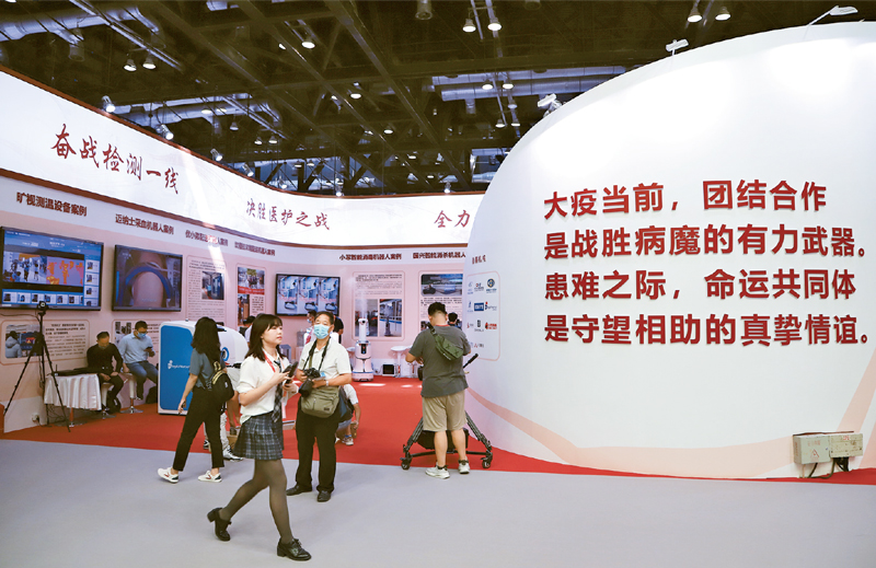 9月4日至9月9日,2020年中國(guó)國(guó)際服務(wù)貿(mào)易交易會(huì)在北京舉行。這是新冠肺炎疫情發(fā)生以來(lái)中國(guó)在線下舉辦的第一場(chǎng)重大國(guó)際經(jīng)貿(mào)活動(dòng),共有來(lái)自148個(gè)國(guó)家和地區(qū)的1.8萬(wàn)家企業(yè)及機(jī)構(gòu)注冊(cè)參展參會(huì)。圖為9月5日,觀眾在公共衛(wèi)生防疫專題展區(qū)參觀。 中新社發(fā) 郭海鵬/攝
