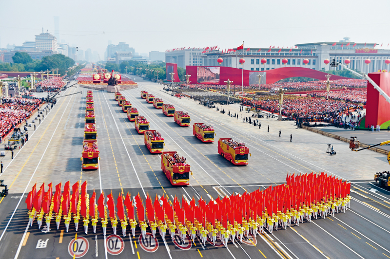 70年來,在中國共產(chǎn)黨堅強(qiáng)領(lǐng)導(dǎo)下,中國人民勇于探索、不斷實(shí)踐,成功開辟了中國特色社會主義道路,推動中國特色社會主義進(jìn)入新時代,中國大踏步趕上了時代,中國人民意氣風(fēng)發(fā)走在了時代前列!