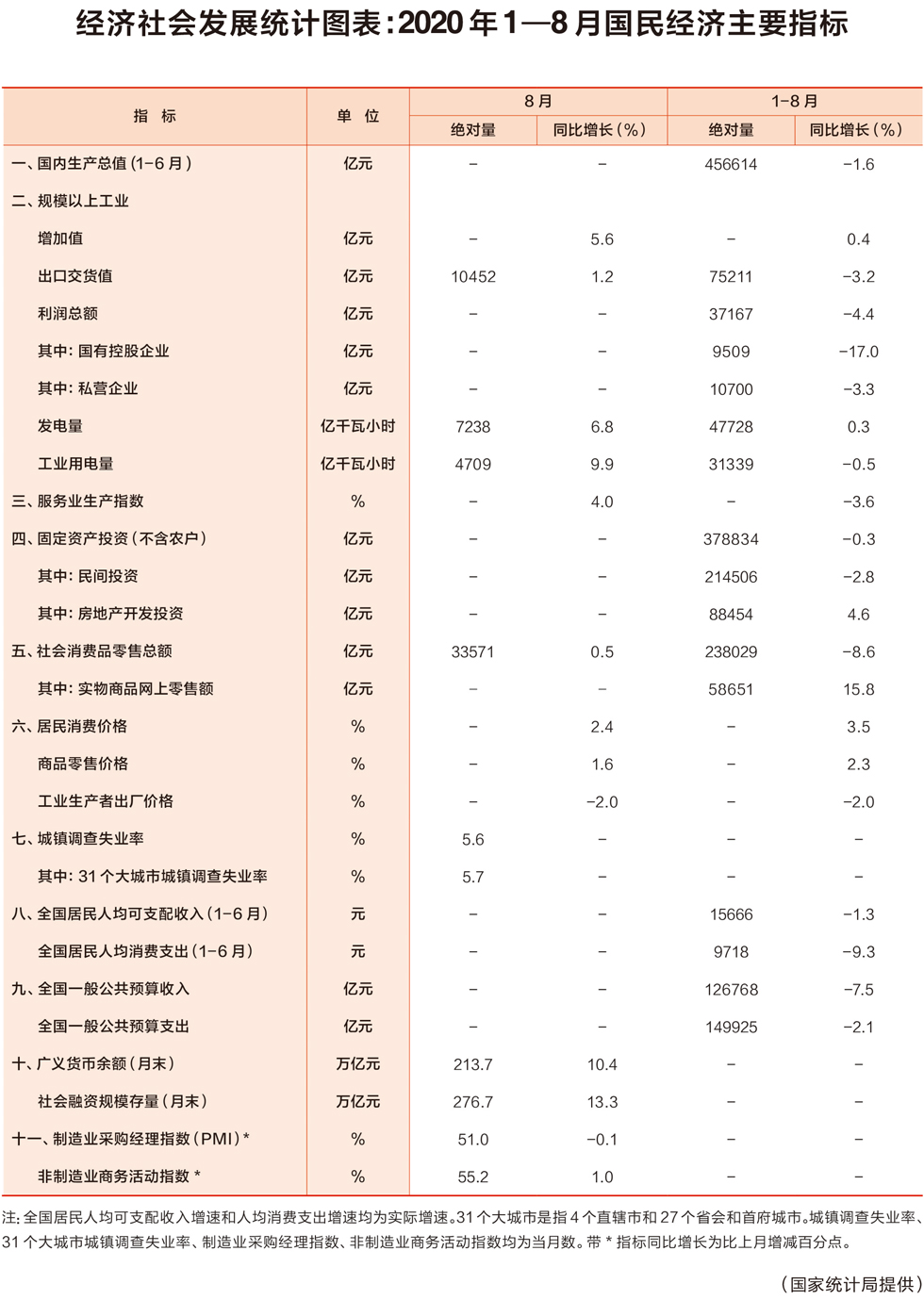 經(jīng)濟(jì)社會(huì)發(fā)展統(tǒng)計(jì)圖表:2020年1—8月國(guó)民經(jīng)濟(jì)主要指標(biāo)