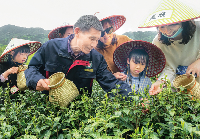 讓老區(qū)農(nóng)村貧困人口脫貧致富,使老區(qū)人民同全國人民一道進入全面小康社會,是習近平總書記一直掛在心上的事。2016年4月24日,習近平總書記在安徽調(diào)研期間,專程來到金寨縣花石鄉(xiāng)大灣村村民陳澤申家的小院,和鄉(xiāng)親們圍坐在一起拉家常,向大家了解脫貧工作情況。4年多時間過去了,陳澤申家已經(jīng)成功脫貧,現(xiàn)在收入芝麻開花節(jié)節(jié)高,日子越過越紅火。圖為2020年4月17日,陳澤申帶游客到茶園體驗采摘。 安徽日報記者 李博/攝