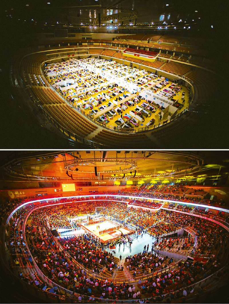 曾作為方艙醫(yī)院的武漢體育中心恢復(fù)了往日熱鬧歡騰的場面。上圖為2020年2月17日,患者在武漢體育中心方艙醫(yī)院休息。下圖為2020年10月4日,觀眾在武漢體育中心觀看籃球賽事。 新華社記者 肖藝九/攝