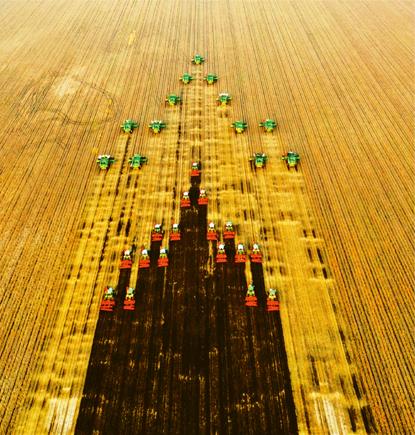 秋收時節(jié),黑龍江省北大荒集團(tuán)的尖山農(nóng)場、鶴山農(nóng)場全面開鐮,喜獲豐收。圖為2020年9月30日,大型農(nóng)機(jī)設(shè)備在列隊收割。 人民視覺供圖