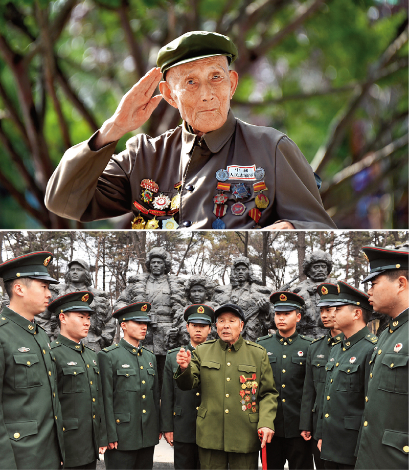上圖為抗美援朝老英雄孫景坤(杜偉/攝);下圖(中)為抗美援朝老英雄徐振明(通化市委宣傳部供圖)。