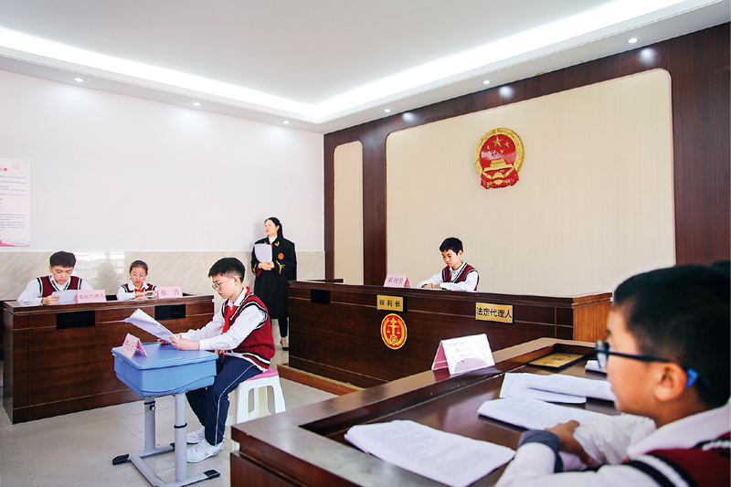 2020年10月30日,安徽省合肥市濱湖世紀(jì)社區(qū)在合肥師范附小三小開展“模擬法庭進(jìn)校園”活動(dòng)。圖為當(dāng)日拍攝的模擬法庭“庭審”現(xiàn)場(chǎng)。 新華社記者 曹力/攝