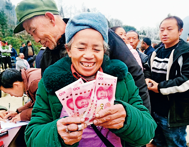 2020年1月23日農(nóng)歷除夕前一天,在貴州省畢節(jié)市納雍縣董地鄉(xiāng)扶貧產(chǎn)業(yè)分紅大會(huì)上,一位村民領(lǐng)到分紅款后笑逐顏開。 新華社記者 駱飛/攝