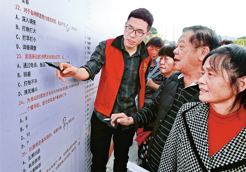 在掃黑除惡專項(xiàng)斗爭(zhēng)中,福建省福州市永泰縣發(fā)揮紀(jì)檢、政法、公安等職能部門聯(lián)動(dòng)作用,建立健全專項(xiàng)斗爭(zhēng)長效機(jī)制,發(fā)動(dòng)群眾檢舉揭發(fā)涉黑涉惡違法犯罪線索,深挖徹查黑惡勢(shì)力及其背后的“保護(hù)傘”,實(shí)現(xiàn)社會(huì)安定有序、人民安居樂業(yè)。圖為2020年1月6日,永泰縣群眾在掃黑除惡專項(xiàng)斗爭(zhēng)宣傳活動(dòng)上進(jìn)行知識(shí)競(jìng)答。 新華社記者 張國俊/攝