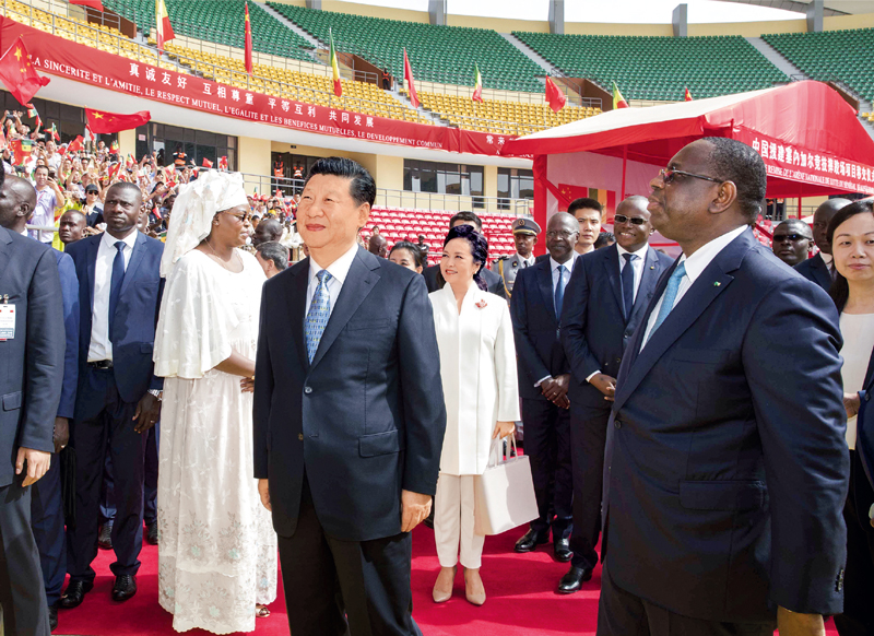 2018年7月22日,國(guó)家主席習(xí)近平在達(dá)喀爾同塞內(nèi)加爾總統(tǒng)薩勒共同出席塞內(nèi)加爾競(jìng)技摔跤場(chǎng)項(xiàng)目移交儀式。 新華社記者 王曄/攝