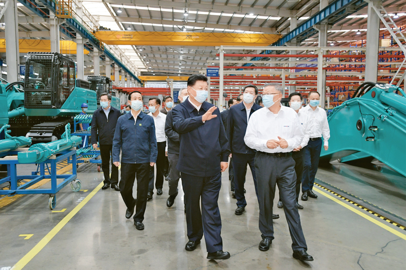 2020年9月16日至18日,中共中央總書記、國家主席、中央軍委主席習(xí)近平在湖南考察。這是17日下午,習(xí)近平在長沙市山河智能裝備股份有限公司生產(chǎn)車間,察看裝備制造流程,了解技術(shù)研發(fā)、生產(chǎn)制造情況。 新華社記者 李學(xué)仁/攝