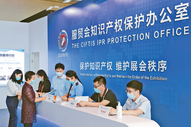 2020年中國(guó)國(guó)際服務(wù)貿(mào)易交易會(huì)上,國(guó)家和地方知識(shí)產(chǎn)權(quán)部門共同派員入駐服貿(mào)會(huì)知識(shí)產(chǎn)權(quán)保護(hù)辦公室,現(xiàn)場(chǎng)開展知識(shí)產(chǎn)權(quán)保護(hù)和咨詢服務(wù),有力保障了服貿(mào)會(huì)的成功舉辦。 中國(guó)知識(shí)產(chǎn)權(quán)報(bào)記者 蔣文杰/攝