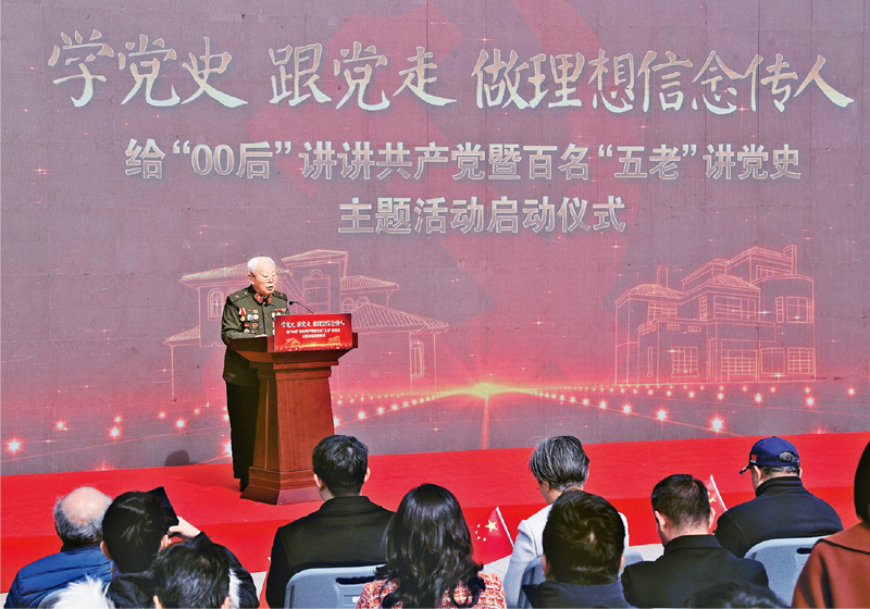 2021年2月23日,“學(xué)黨史 跟黨走 做理想信念傳人——給‘00后’講講共產(chǎn)黨暨百名‘五老’講黨史主題活動(dòng)”在位于上海市嘉定區(qū)的外岡游擊隊(duì)紀(jì)念館正式啟動(dòng)。本次活動(dòng)拉開(kāi)了上海教育系統(tǒng)黨史學(xué)習(xí)教育的序幕,將組織包括新四軍老戰(zhàn)士在內(nèi)的一批老干部、老戰(zhàn)士、老專(zhuān)家、老教師、老模范走進(jìn)校園,以“校外輔導(dǎo)員”的方式,參與大學(xué)和中小學(xué)的思想政治教育,教育引導(dǎo)青少年始終聽(tīng)黨的話(huà)、永遠(yuǎn)跟黨走。圖為上海市新四軍歷史研究會(huì)名譽(yù)會(huì)長(zhǎng)、九旬新四軍老戰(zhàn)士阮武昌在活動(dòng)現(xiàn)場(chǎng)講述新四軍的抗日故事。 新華社記者 劉穎/攝