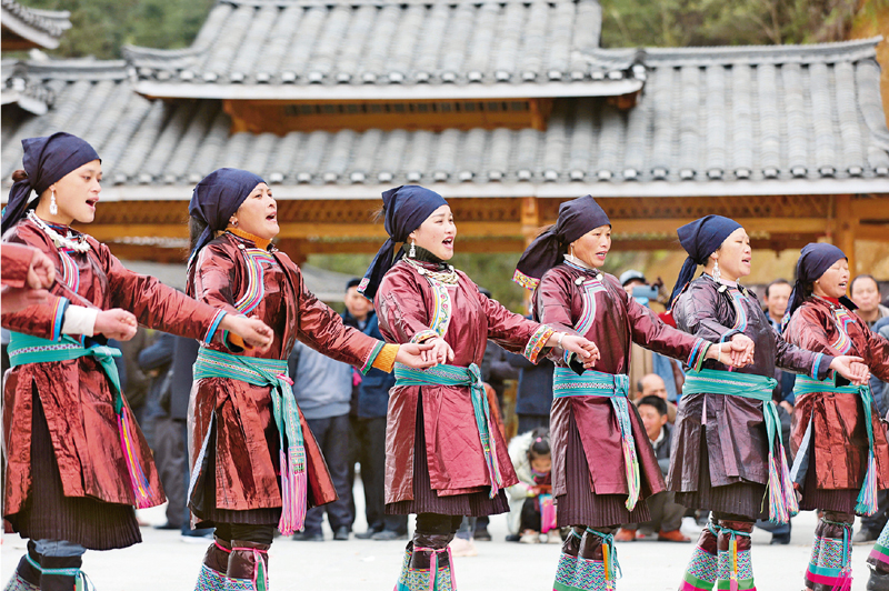 2021年3月21日,廣西柳州三江侗族自治縣八江鎮(zhèn)布代村舉辦傳統(tǒng)春社節(jié),當(dāng)?shù)厝罕娚碇褡迨⒀b,縱情傳唱百年黨史,激情歡歌家鄉(xiāng)巨變,動(dòng)情喜頌黨的恩情。 人民視覺(jué) 龔普康/攝