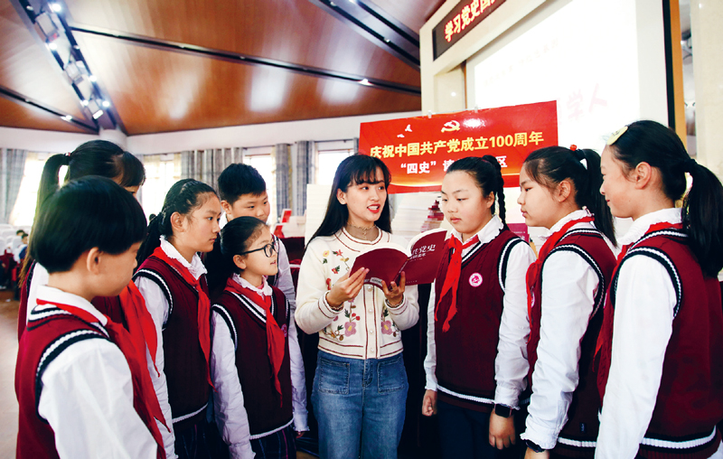 2021年4月9日,安徽省合肥市濱湖世紀社區(qū)黨委聯(lián)合合肥市師范附屬第三小學開展“學黨史”主題活動。圖為老師與學生們分享黨史學習心得?!⌒氯A社記者 曹力/攝